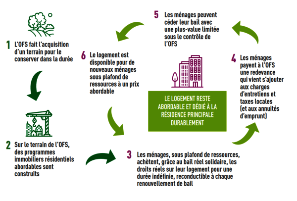 Le principe d'un OFS est simple : acheter le foncier d'un appartement ou d'une maison, c'est à dire son terrain, une composante importante du prix d'un logement, de façon à ce que celui-ci reste perpétuellement abordable et inférieur au prix du marché, et ce même dans les villes attractives et/ou densément peuplées.