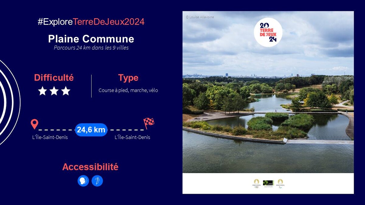 Vous prendrez le départ au niveau de l’écoquartier fluvial de L’Ile-Saint-Denis qui accueillera une partie du Village des Athlètes, pour arriver à l’église de Saint-Denis. Le tracé du parcours passe ensuite au cœur du quartier Pleyel qui accueillera bientôt l’une des gares du Grand Paris Express et qui a également été choisi pour recevoir le Village des athlètes en 2024. Vous longerez ensuite le canal de Saint-Denis pour arriver devant le Stade de France, l’un des principaux sites de la compétition puisque s’y dérouleront les compétitions d’athlétisme et de rugby à 7. Cet itinéraire, réservé à des coureurs disposant d’une très bonne condition physique, vous fera ensuite traverser Aubervilliers pour arriver au parc Georges Valbon de La Courneuve, où prendra place l’un des centres d’entraînement pour les équipes nationales d’athlétisme en 2024. Votre tour du territoire passera ensuite par Stains et sa cité-jardins jusqu’à la Butte-Pinson, écrin de verdure sur les hauteurs boisées de Villetaneuse. En fin de parcours, vous pourrez observer l’université Sorbonne Paris Nord avant de finir le parcours en longeant les berges de Seine jusqu’à revenir sur l’Île-Saint-Denis.