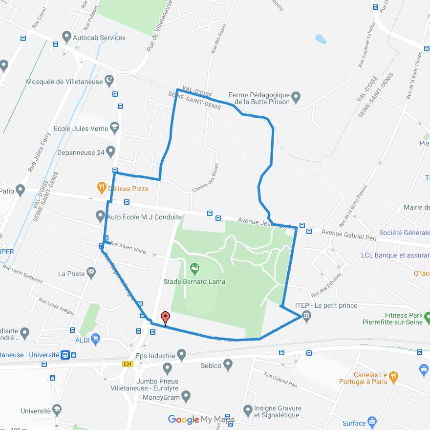 Pour réaliser ce parcours d’un peu moins de 3 km, vous prendrez le départ au niveau du stade Bernard Lama, puis passerez devant la médiathèque Jean Renaudie et l’école Jules Verne. Vous traverserez ensuite le parc naturel régional de la Butte Pinson sur les hauteurs boisées de la commune, labellisé espace vert écologique, garantissant ainsi une gestion éthique et écologique du site. La fin du parcours vous fera enfin passer devant l’Institut thérapeutique éducatif et pédagogique (ITEP) “Le Petit prince”.