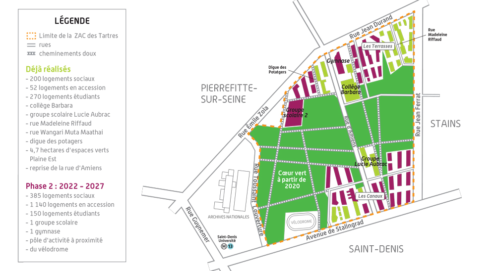 À cheval sur Stains, Saint-Denis et sa commune déléguée Pierrefitte-sur-Seine, le site emblématique des Tartres est au centre d’un ambitieux projet d’aménagement débuté en 2012 et qui redessine progressivement ses contours : création d’un nouveau quartier mêlant logements, équipements publics et activités, organisé autour d’un vaste cœur vert agricole et paysagé.